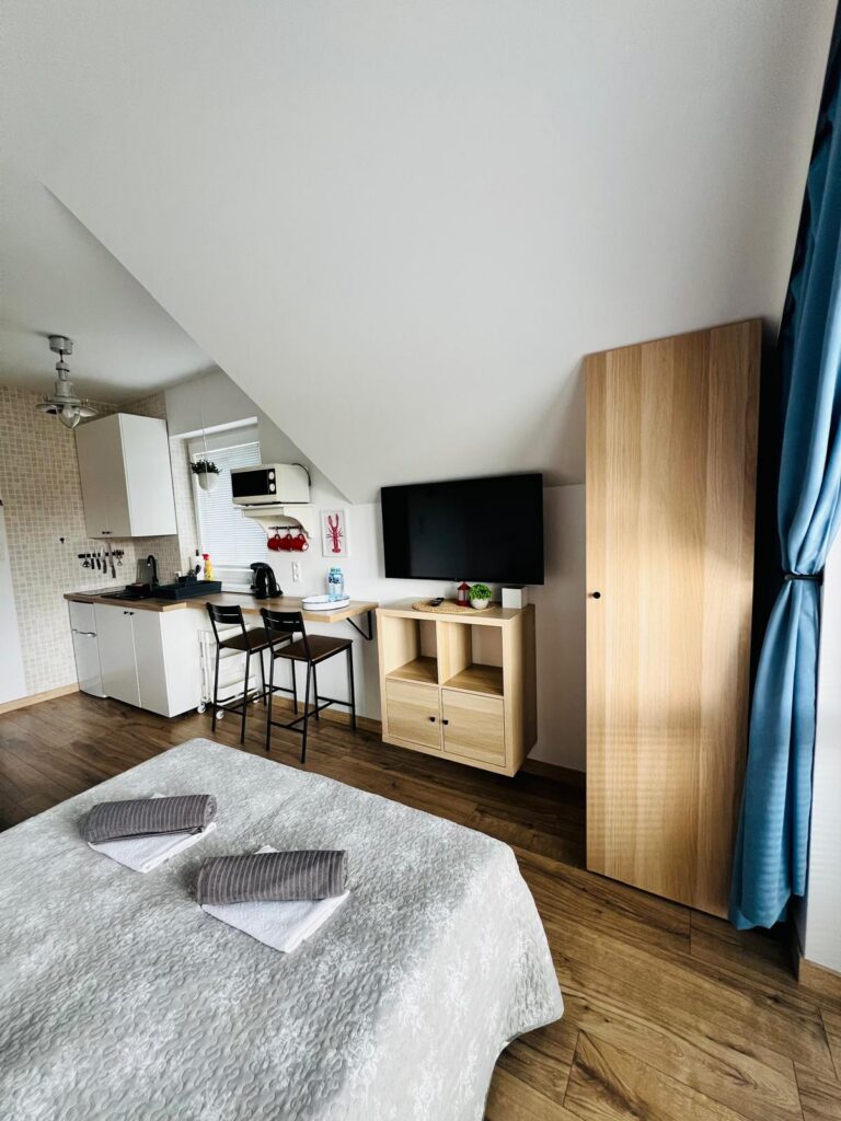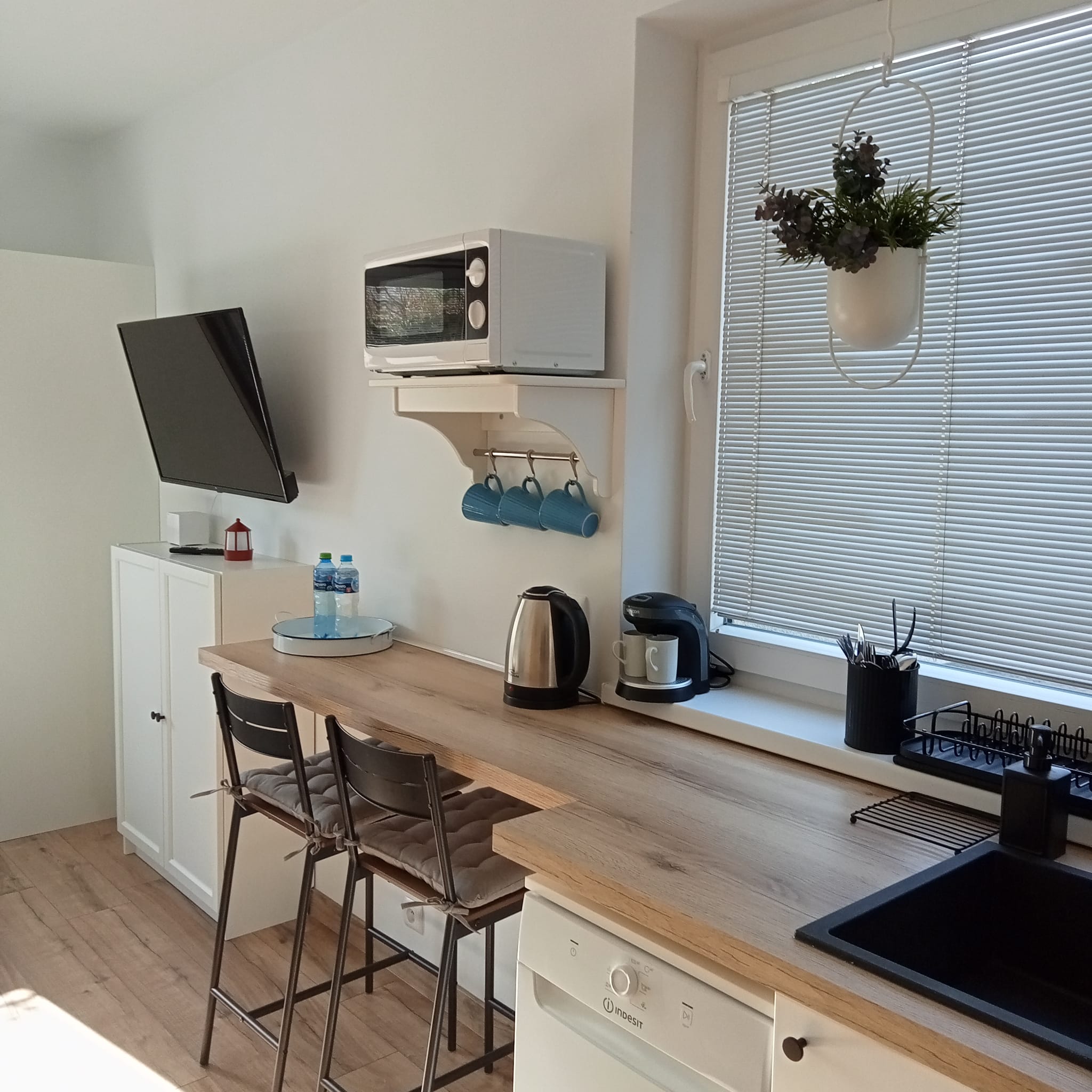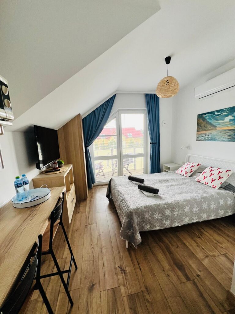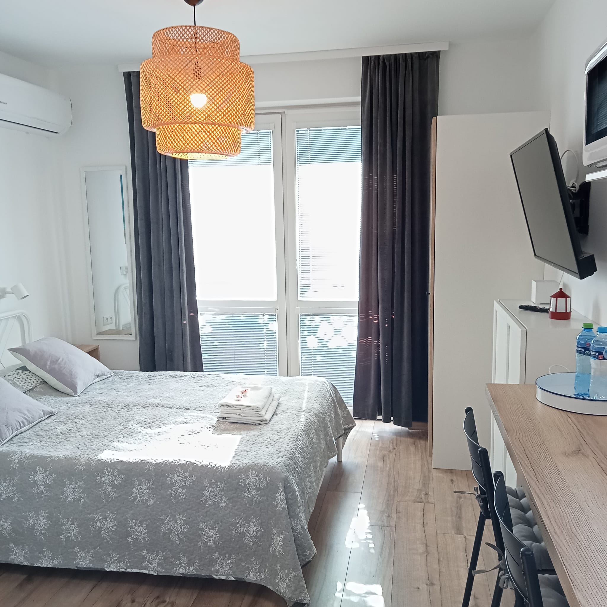 Kameralny apartament dla dwóch osób z niezależnym wejściem, zapewniającym prywatność i swobodę pobytu. Jasne, nowoczesne wnętrze z aneksem kuchennym, łazienką, klimatyzacją oraz balkonem lub tarasem tworzy idealne warunki do wypoczynku nad morzem. Do wyboru parter lub piętro oraz strona wschodnia lub zachodnia.