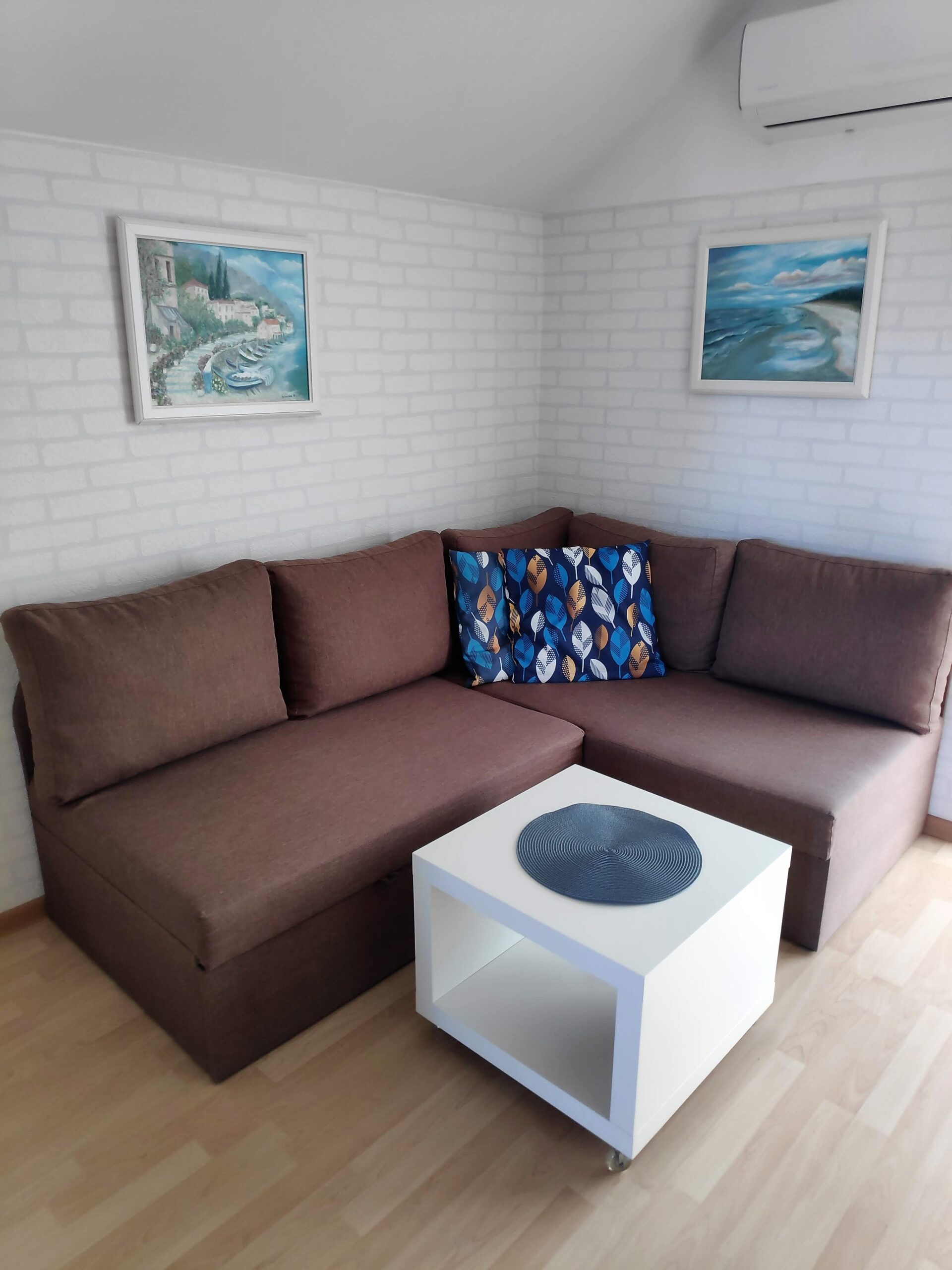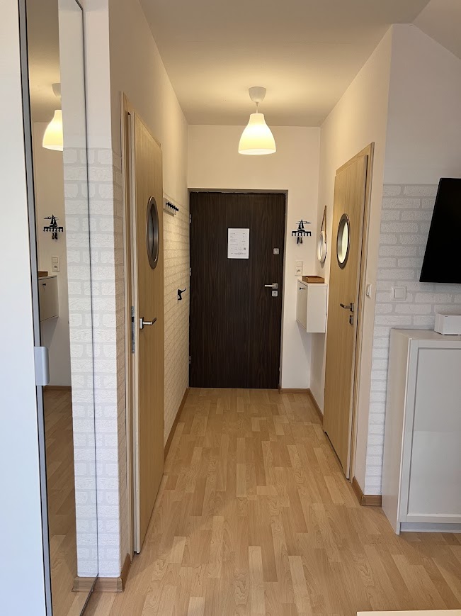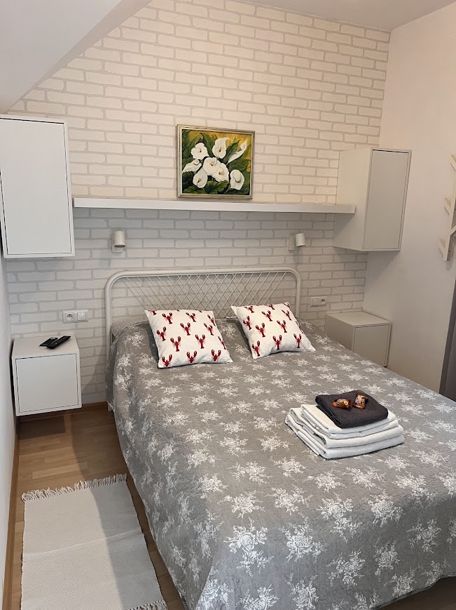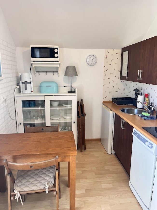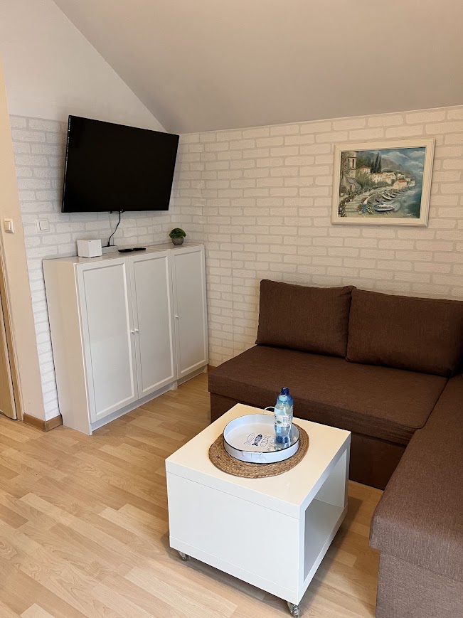 Apartament składa się z osobnej sypialni oraz części dziennej połączonej z aneksem kuchennym, w której znajduje się rozkładany narożnik. Do dyspozycji gości jest klimatyzacja, zmywarka oraz funkcjonalna przestrzeń zaprojektowana z myślą o rodzinach i małych grupach.