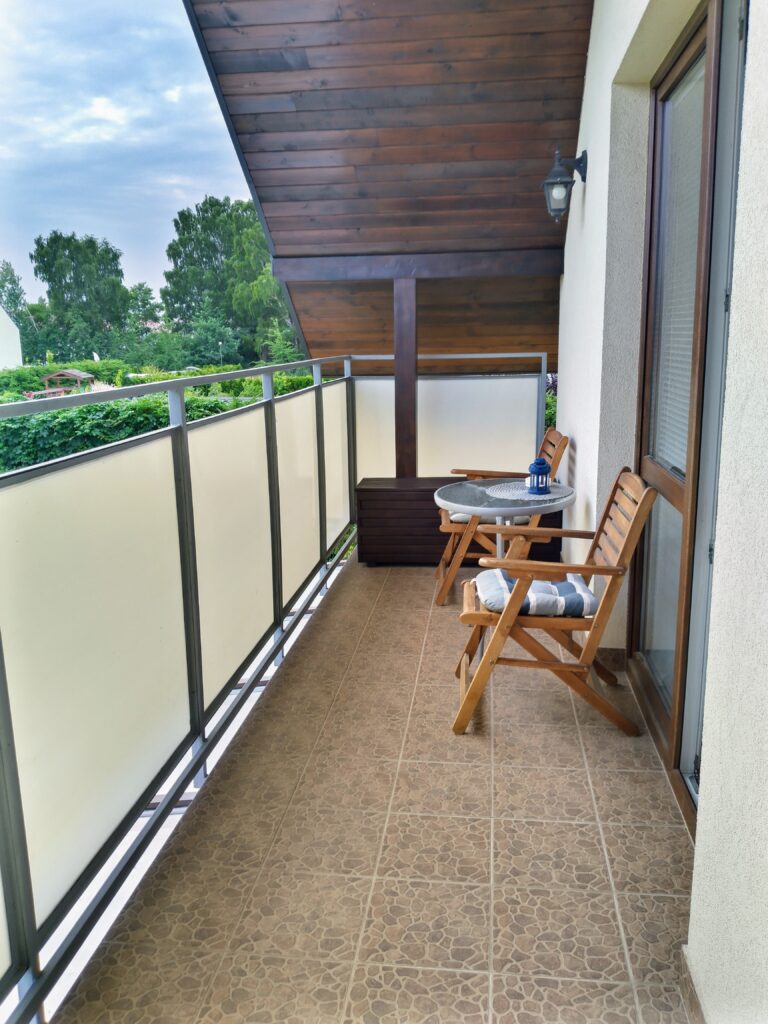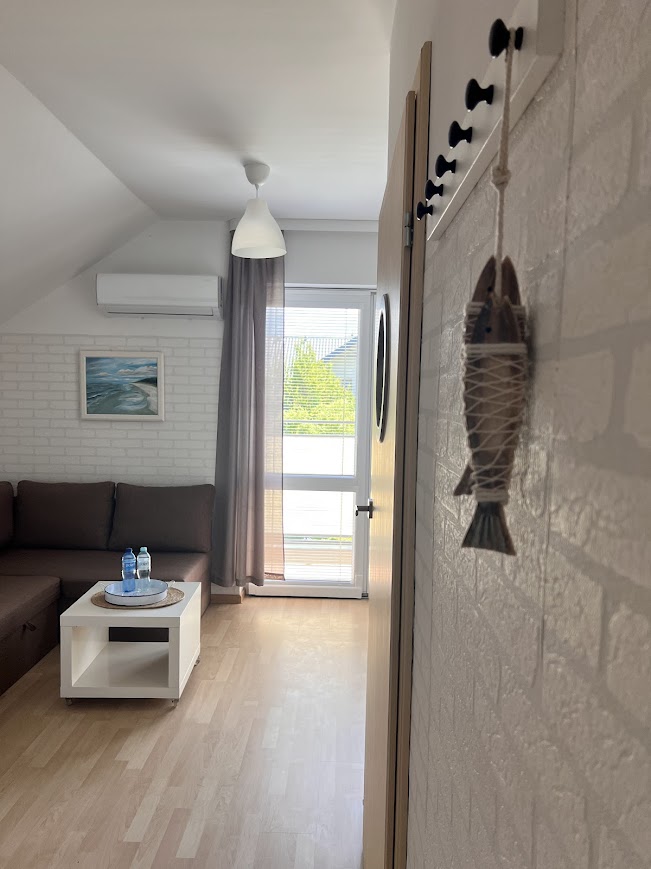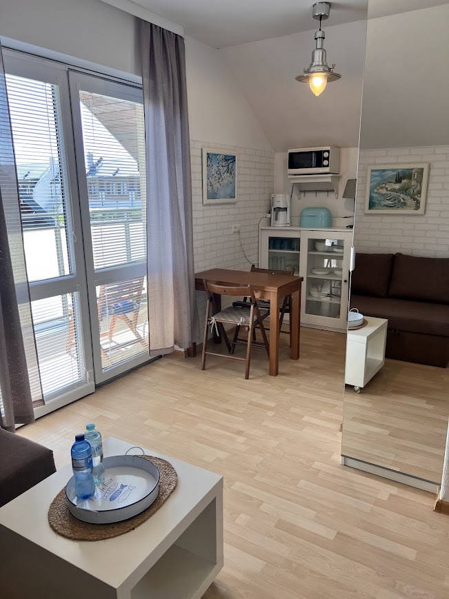 Przestronny apartament dla 4 osób z niezależnym wejściem, stworzony z myślą o wygodnym wypoczynku nad morzem. Zlokalizowany na piętrze, z dużym, słonecznym balkonem i południową ekspozycją, oferuje przyjemny widok na ogród oraz plac zabaw.